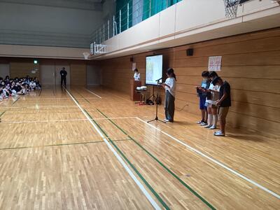 終業式の後に6年生が修学旅行の報告会を行いました。