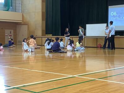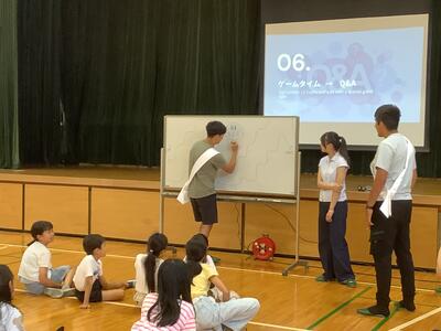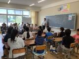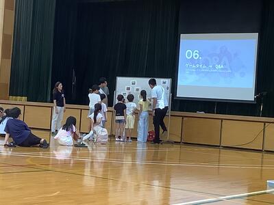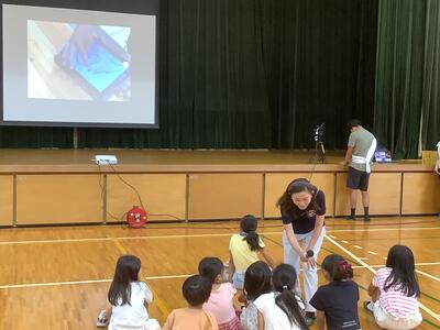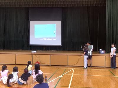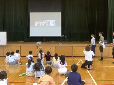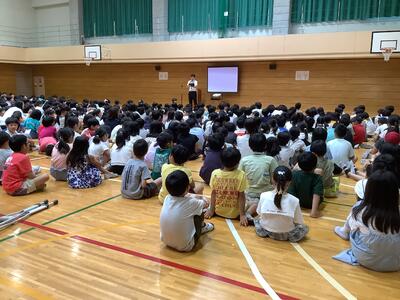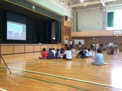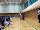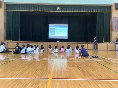 精道小学校体育館に来てくれました。始めはやや緊張ぎみでしたが、高校生2人の話を聞いてい