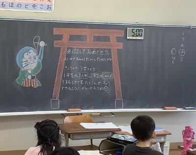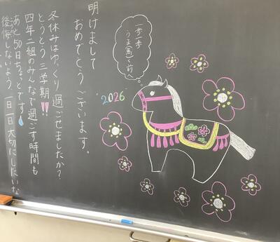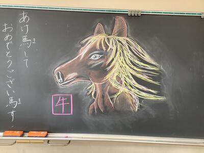 たくさんみられました。黒板には午年にちなんだ絵が描かれている