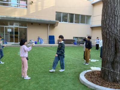 12月15日(月)中庭で4年生が理科の実験をしていました。