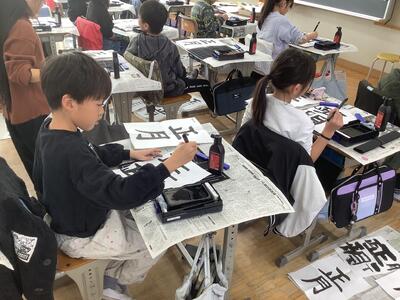 書き初めの練習でしょうか?3年生が真剣な表情で習字の学習を